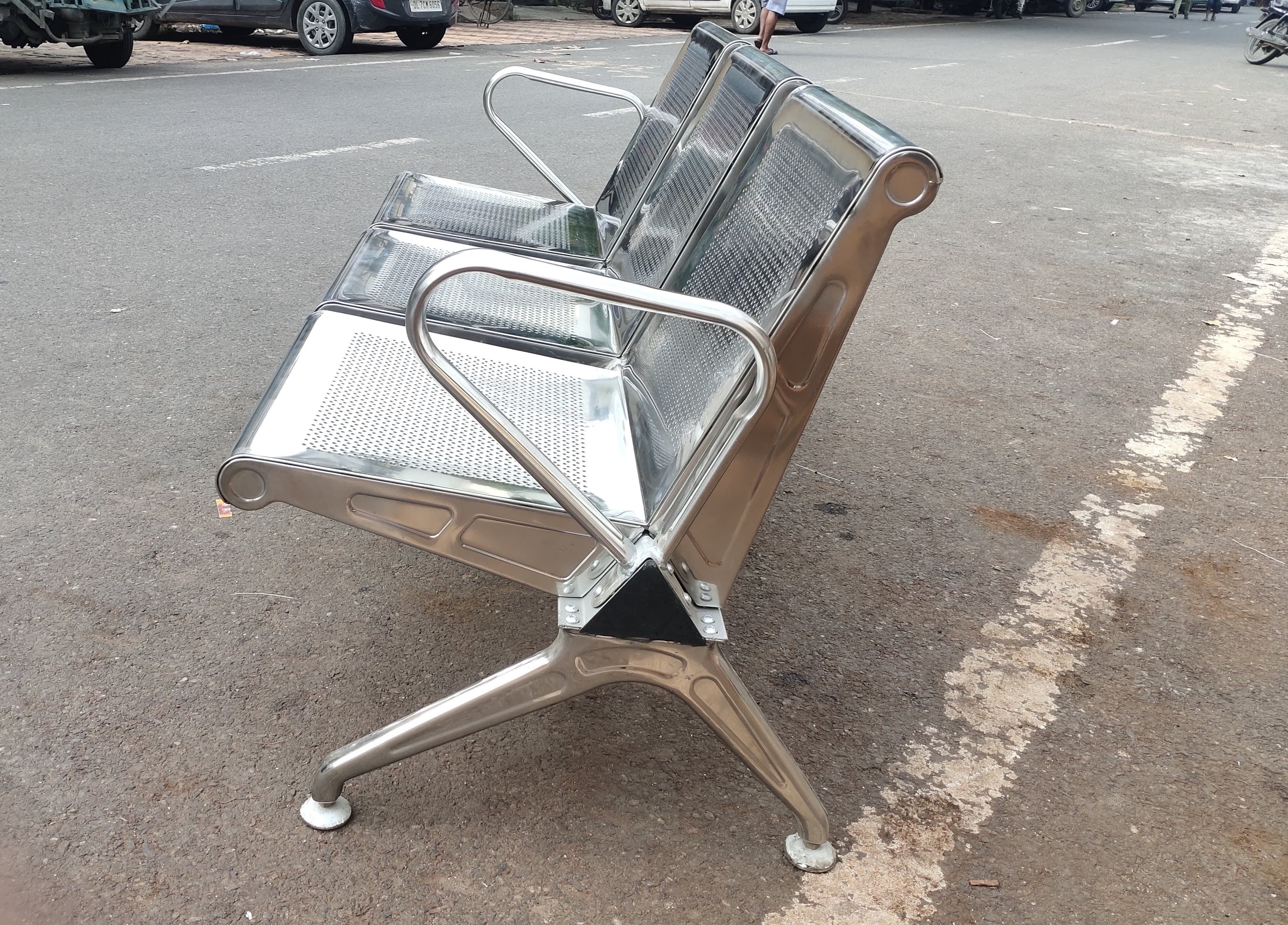 Each Metro 3 Seater Chair from Kunwar Bros is built using premium stainless steel (SS 202 / SS 304) or MS powder-coated material. Our chairs are crafted using CNC laser cutting, TIG/ARC welding, and anti-rust finishing to ensure durability and superior quality. These chairs are ideal for metro stations, airports, hospitals, government offices, and public waiting areas.